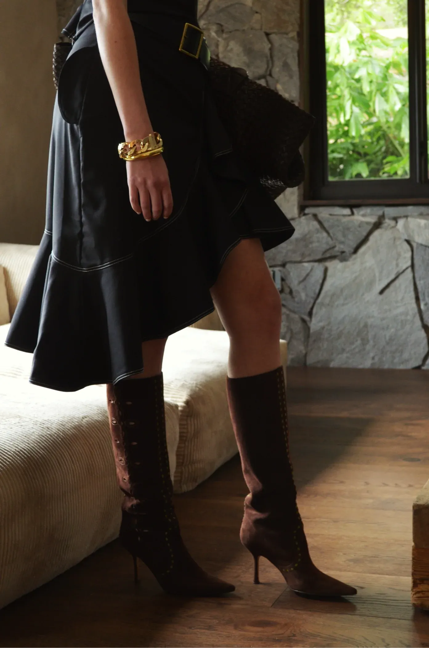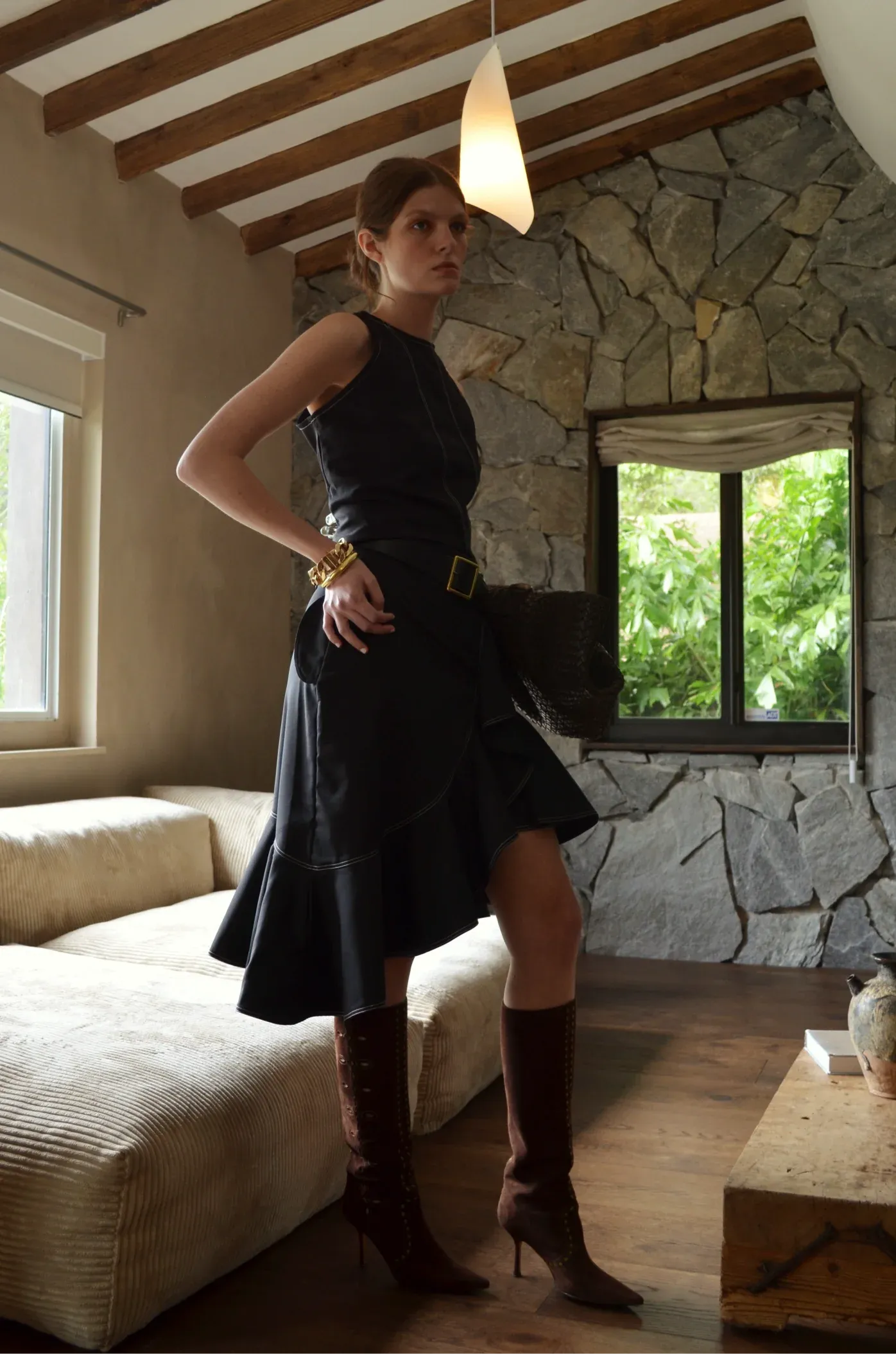 La Falda Alma presenta un diseño asimétrico con terminación en puntas, acompañado de detalles en pespuntes y arandelas que aportan sofisticación. Ideal para looks elegantes y contemporáneos.