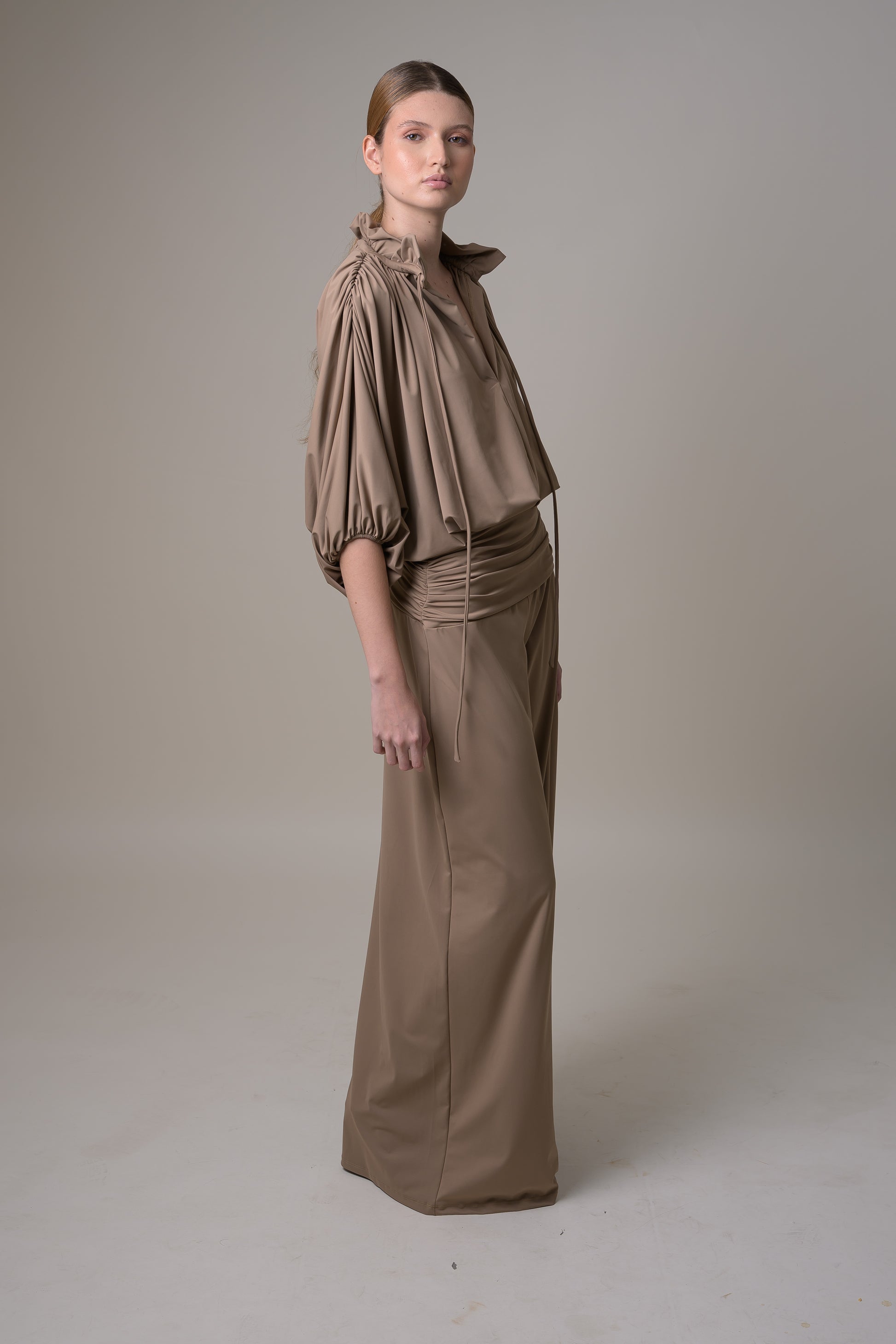 La Blusa Aleya se define por su cuello fruncido y su silueta amplia de caída fluida. Su diseño incorpora un delicado drapeado y una faja elástica que acentúa la cintura con sutileza, creando un contraste equilibrado entre estructura y movimiento.