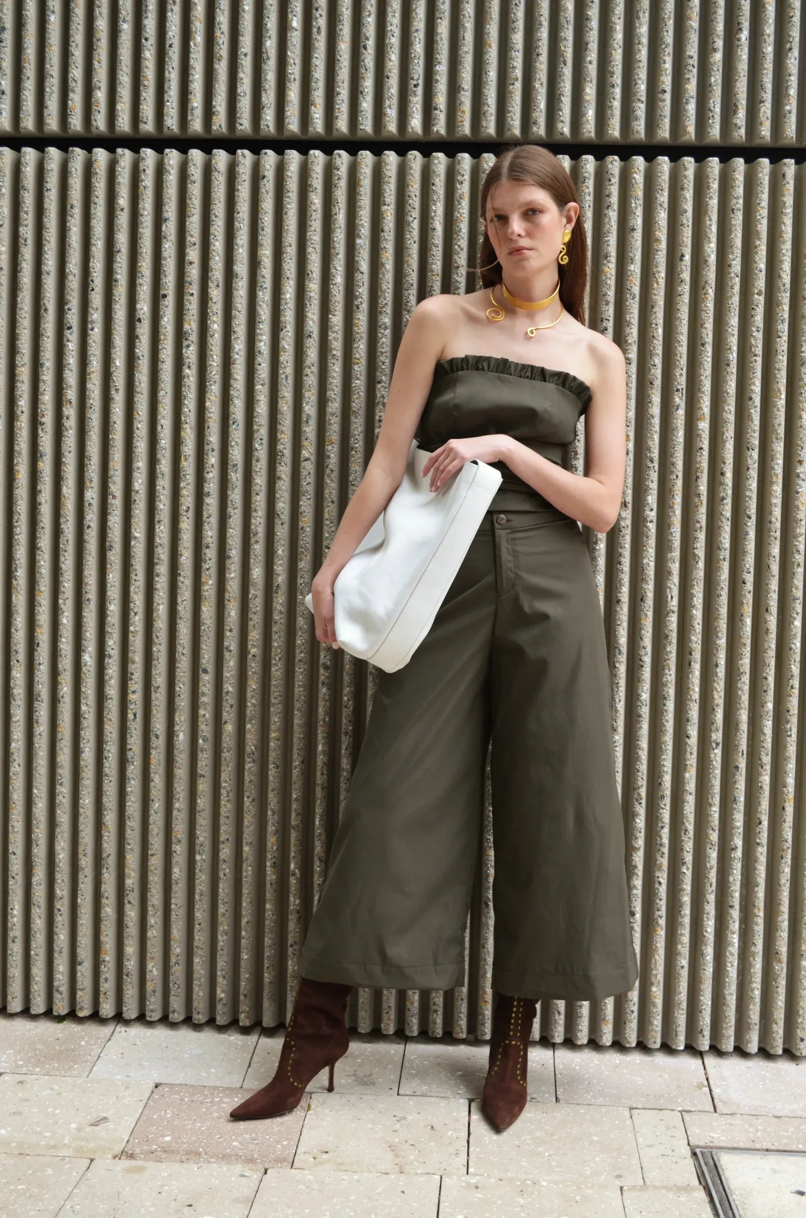 Pantalón culotte elaborado en un material ligero y estructurado, ideal para un look cómodo y elegante.