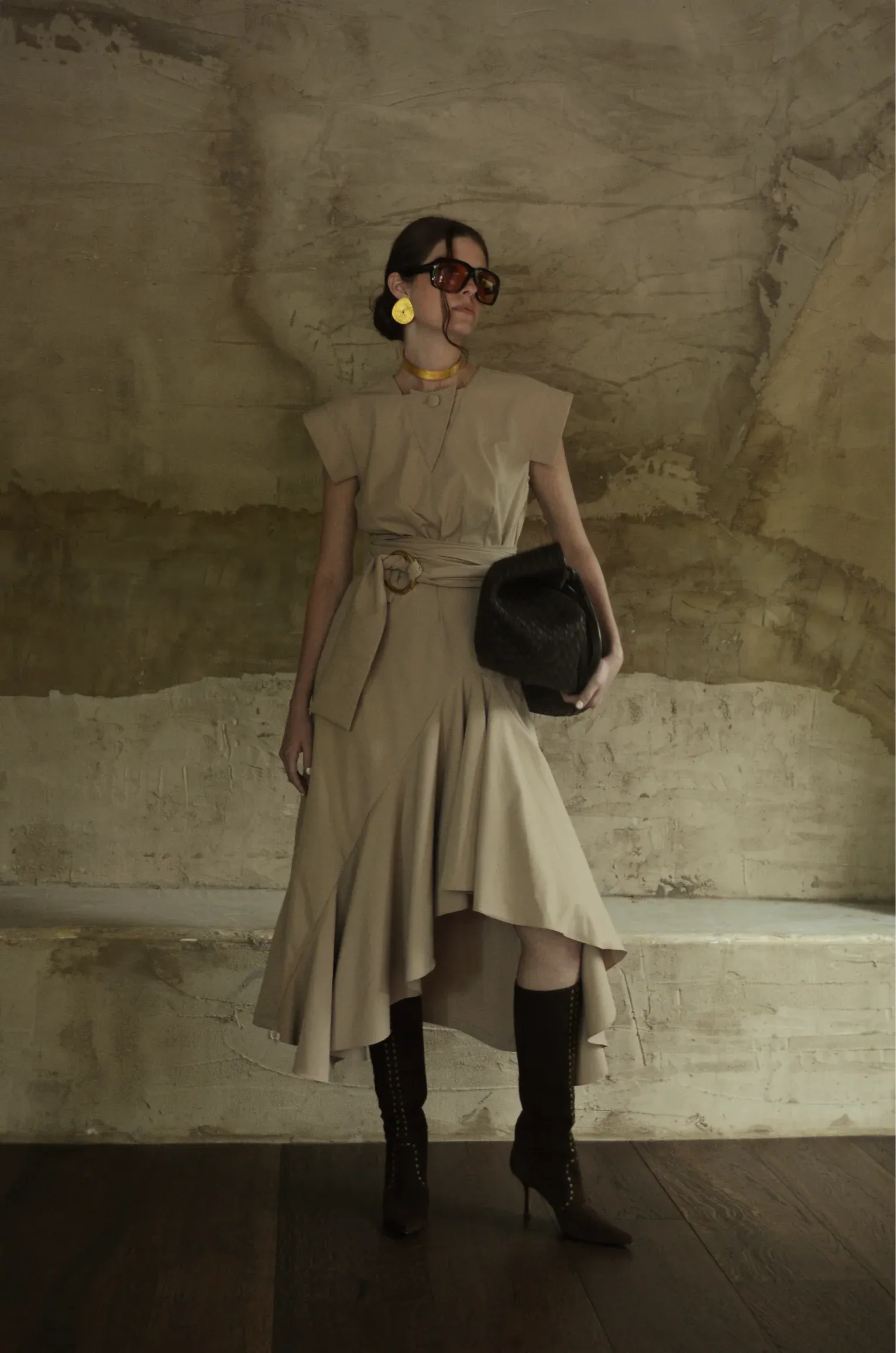 VESTIDO ASIMÉTRICO CON ABOTONADURA DECORATIVA EN ESCOTE Y ARANDELA EN FALDA.