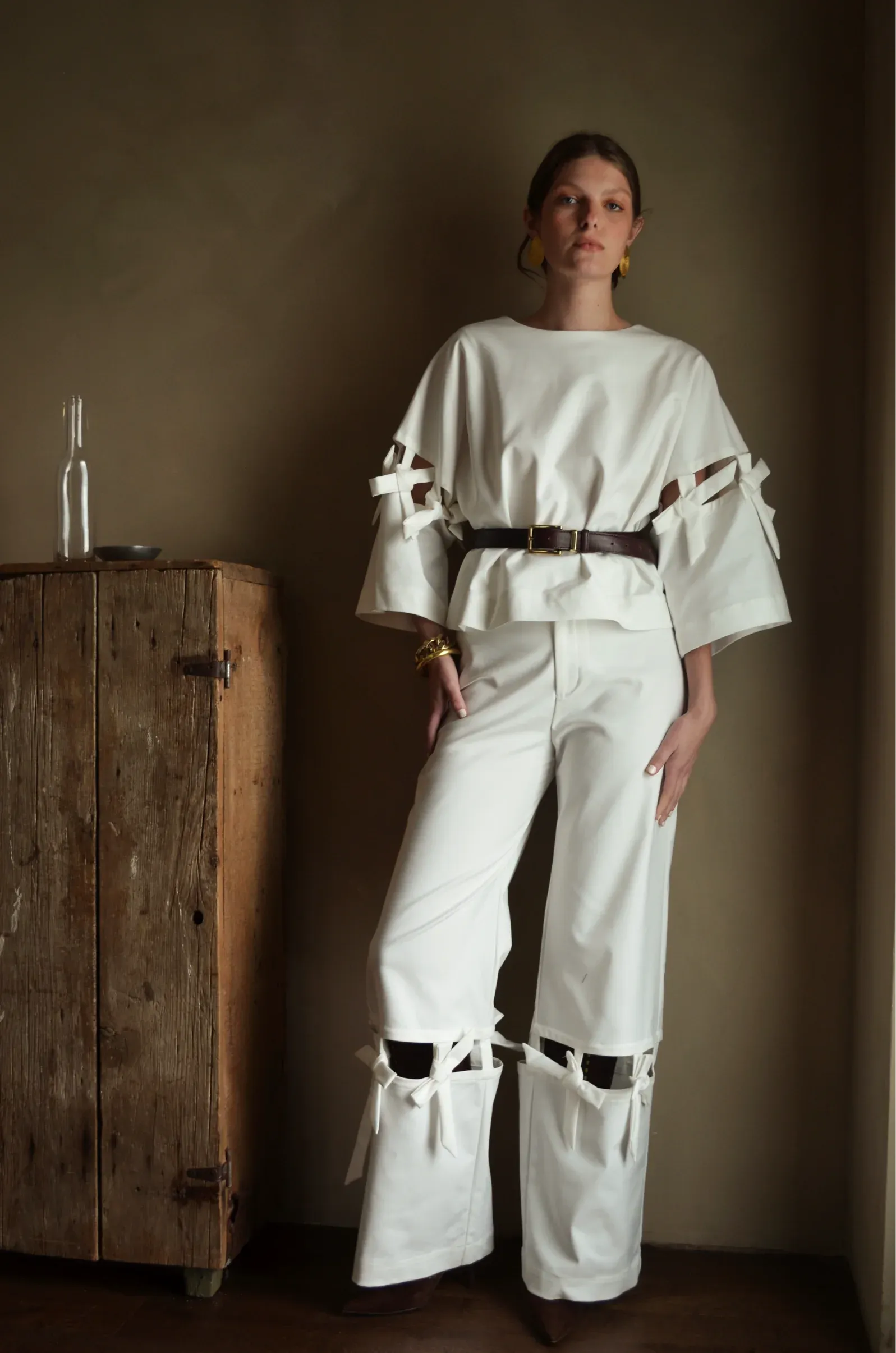 Pantalón de corte clásico, confeccionado en un material cómodo. Su detalle de lazos en la bota le añade un toque moderno y versátil.