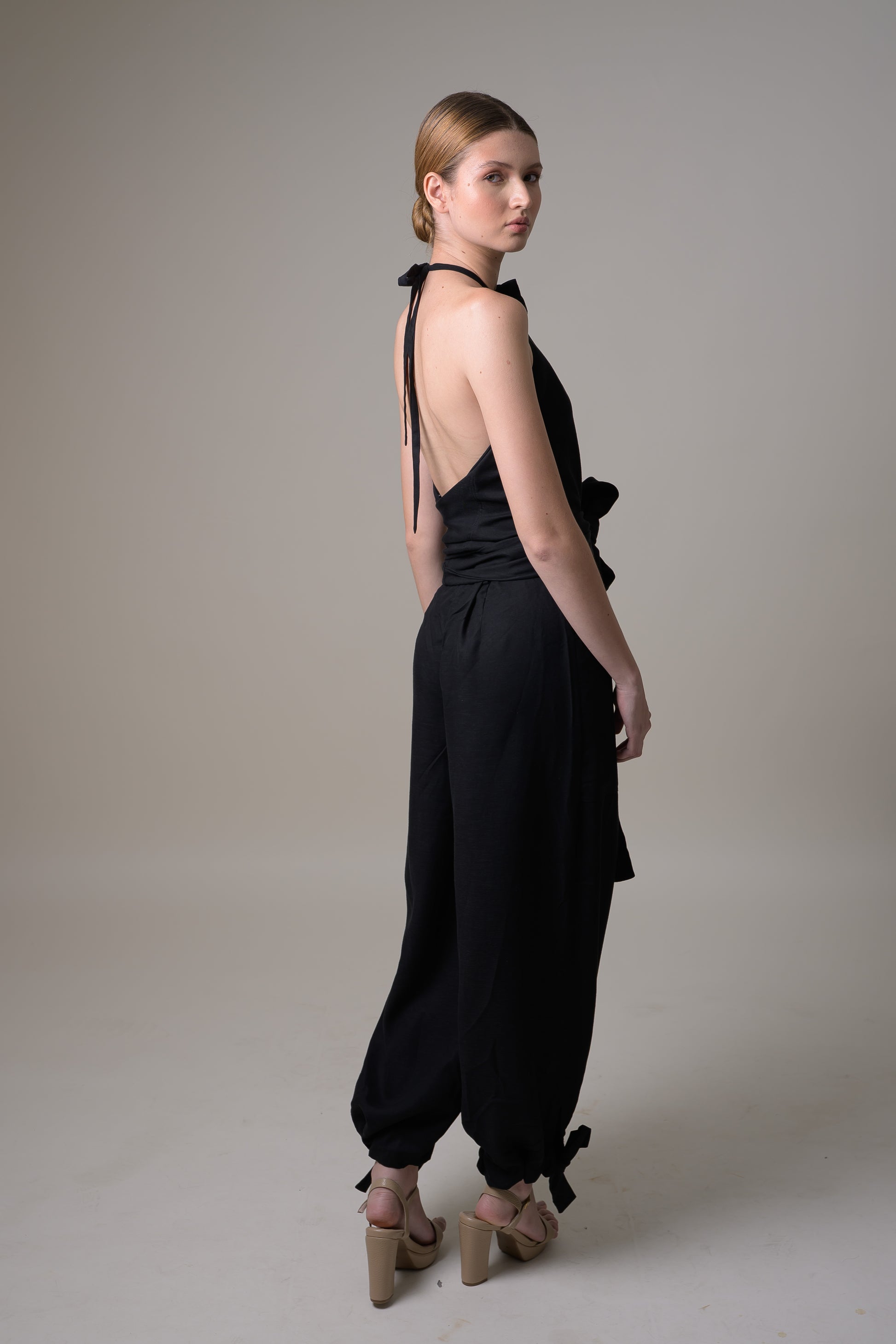 Top de silueta halter con cuello fruncido que enmarca el cuello y los hombros de manera sutil. Su diseño de espalda descubierta aporta ligereza y equilibrio, mientras el fruncido genera una caída fluida que se adapta al cuerpo con naturalidad.
