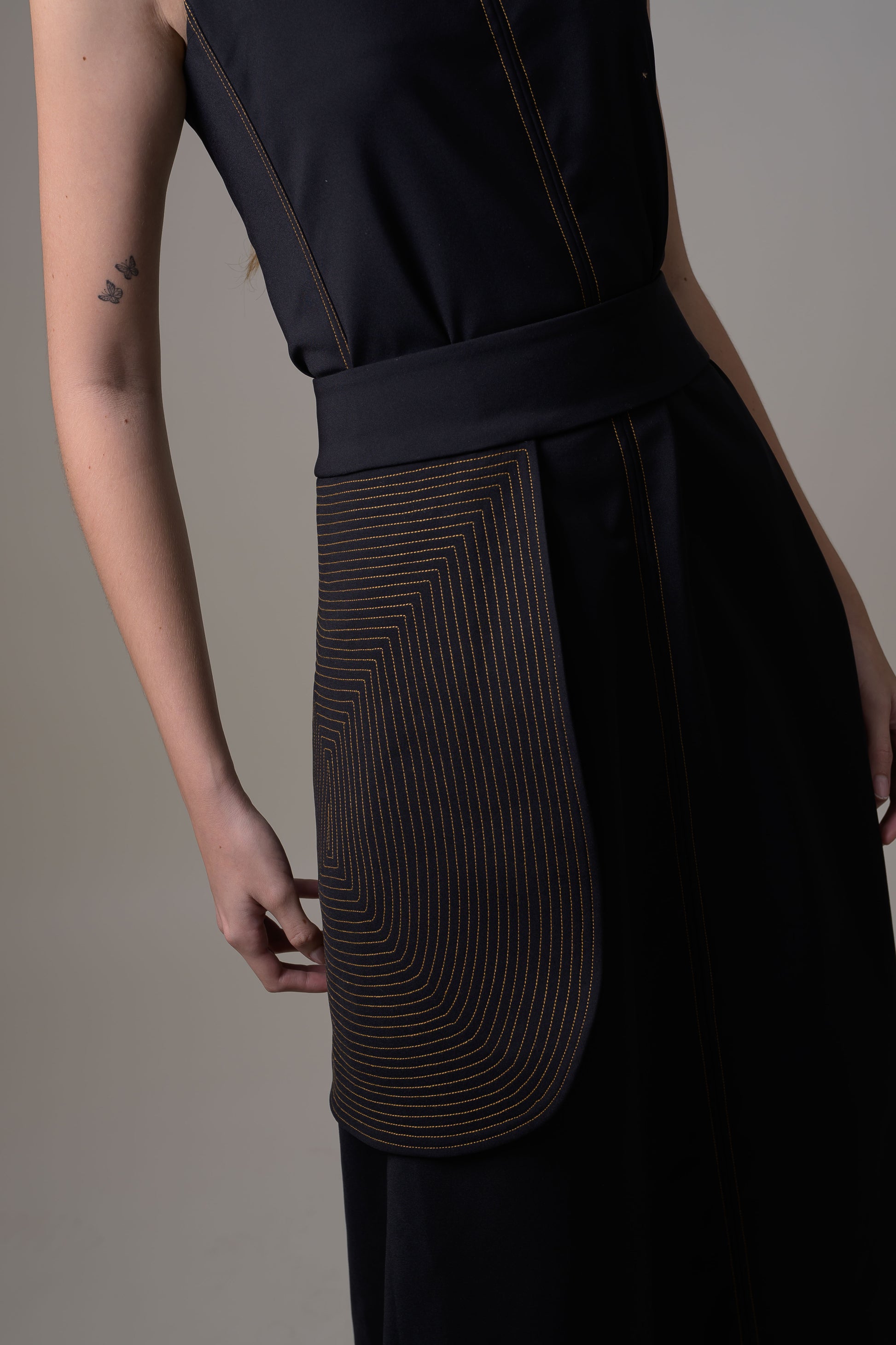El Vestido Sorel combina líneas limpias y detalles para una silueta sofisticada. Su cuello cuadrado enmarca con elegancia, mientras que el fajón pespuntado define la cintura y aporta un acento estructurado.